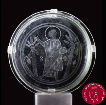 La coppa venne ritrovata nel 1839 nei pressi del paese di Ittiri, in provincia di Sassari, in una tomba “a cappuccina” (sepoltura realizzata con le classiche tegole romane, note come embrici, disposte a realizzare una copertura a doppio spiovente, e coppi a coprire la congiunzione tra due tegole; il defunto veniva adagiato direttamente sulla terra o a volte su delle tegole poste in piano). Il reperto dopo alcuni passaggi di proprietà, fu donata nel 1859 all’allora Regio Museo Archeologico di Cagliari (oggi vecchio Museo Archeologico sito in piazza Indipendenza), è un esemplare unico nel suo genere, in Sardegna finora non ha confronti. E’ in ottimo stato di conservazione, è di forma emisferica e, sulla parete esterna, la ricca decorazione incisa e molata raffigura Gesù Cristo docente, che regge con una mano il codex, e trionfante; questa modalità di rappresentazione affonda le sue origini nel mondo pagano, richiama infatti in maniera stringente l’iconografia classica dell’imperatore che parla richiamando l’attenzione del proprio uditorio. L’immagine è racchiusa entro due palme colme di frutti e sullo sfondo sono presenti quattro rombi, secondo alcuni interpretabili come stelle del cielo, secondo altri simbolo degli evangelisti. In assenza di documentazione archeologica, è difficile dire quale fosse la funzione del manufatto e se avesse un utilizzo immediatamente pratico, il fatto che sia stato ritrovato all’interno di una tomba, fa pensare che si trattasse di un oggetto caro al defunto. Il confronto più stringente, all’interno della vasta produzione vitrea con raffigurazioni riconducibili al repertorio cristiano, è un reperto analogo rinvenuto a Desenzano (Brescia) in cui è rappresentato Cristo con la tunica e il capo nimbato e un gallo.
