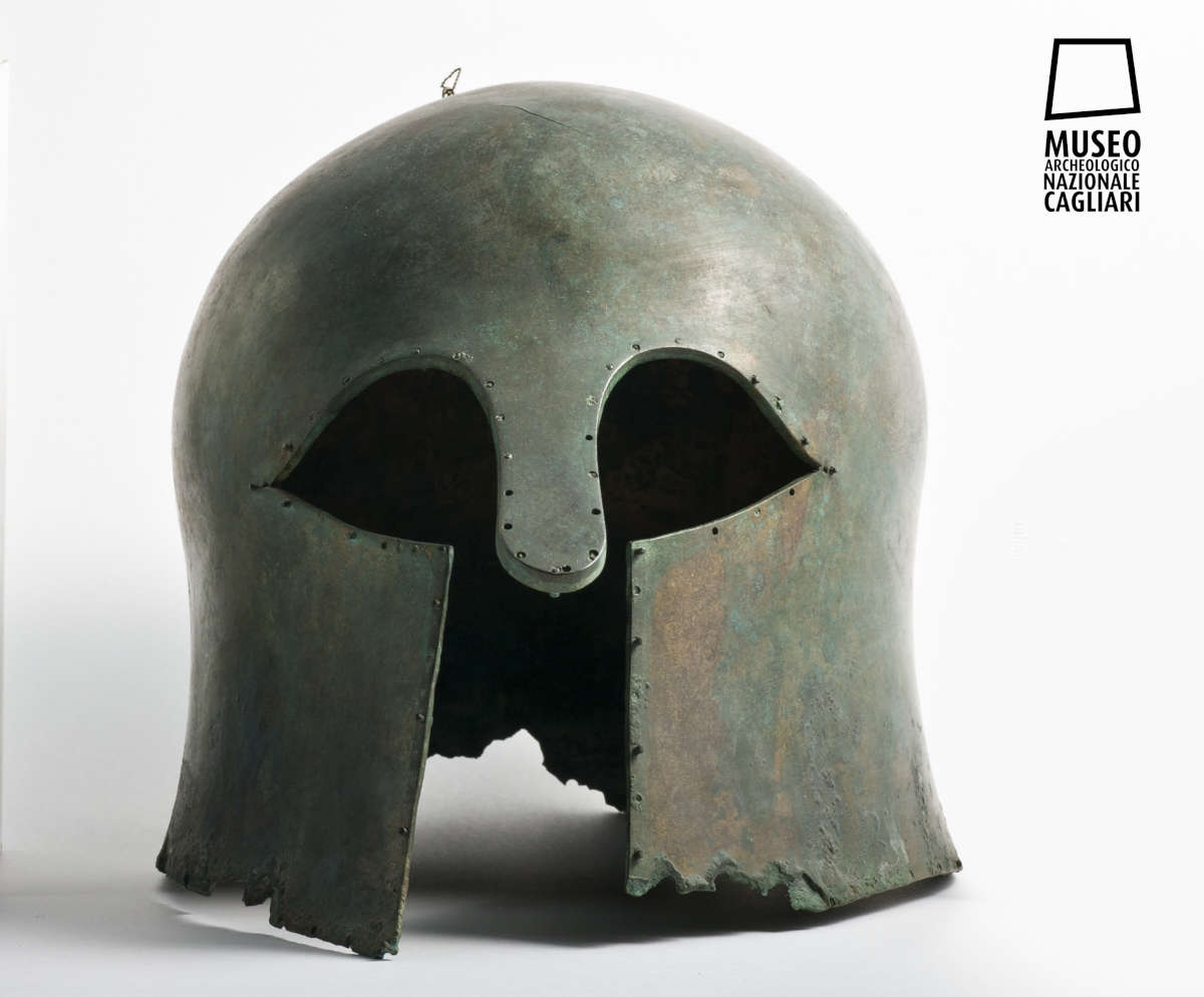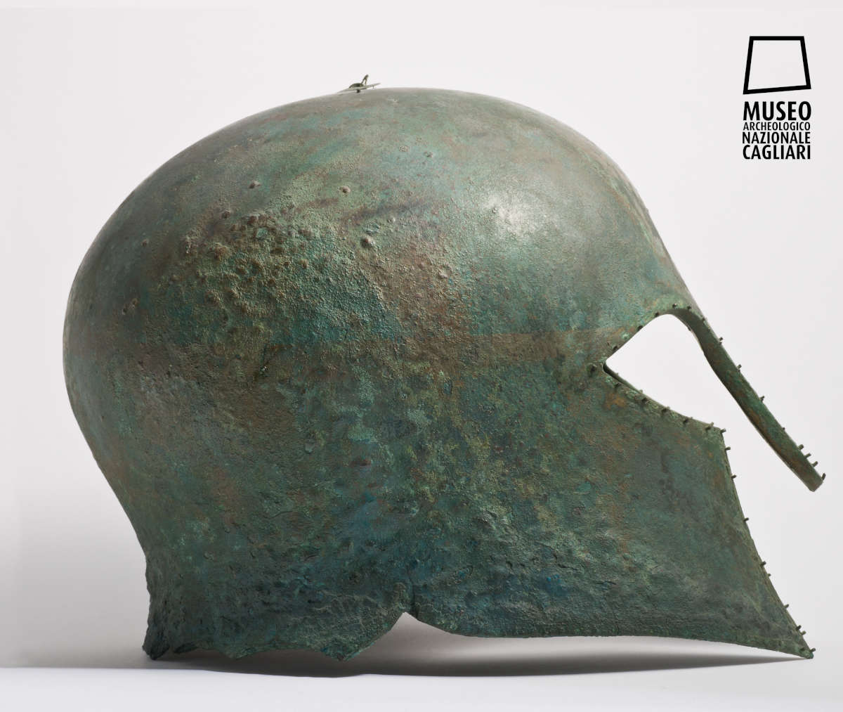 Gli elmi sono di tipo corinzio con «copertura integrale del capo, da cui sono risparmiati gli occhi e la bocca, con paranaso centrale arrotondato, mentre posteriormente una proiezione ricurva è funzionale per la protezione della nuca. Il taglio degli occhi è a mandorla. Il bordo è arricchito da una decorazione imitante la cucitura del cuoio. Nella parte sommitale residua l’attacco originario della punta in materiale deperibile» (da LA SARDEGNA FENICIA E PUNICA, Corpora delle antichità della Sardegna, a cura di Michele Guirguis, Regione Autonoma della Sardegna, Ilisso, 2017).
