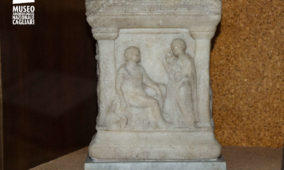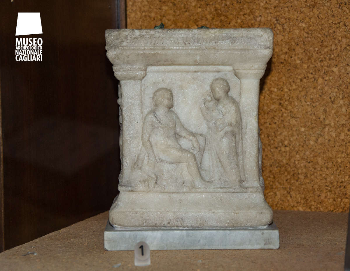 Anche nella piena età romana sono molti gli elementi della cultura punica che rimangono ben radicati in tutte le manifestazioni, in particolare quelle legate alla religiosità. A Sulci, ma anche a Karales (Cagliari), la lingua utilizzata nelle iscrizioni votive è quella punica. Un esempio di questa continuità culturale tra il periodo punico e quello romano è la piccola base in pietra esposta nella vetrina, decorata a rilievo su tre lati con figure di divinità, che in antico reggeva una piccola statua in bronzo, e su cui è incisa un’iscrizione in caratteri punici, in cui il dedicante Hmlk elenca la sua genealogia sino al trisnonno.