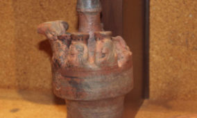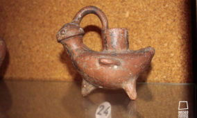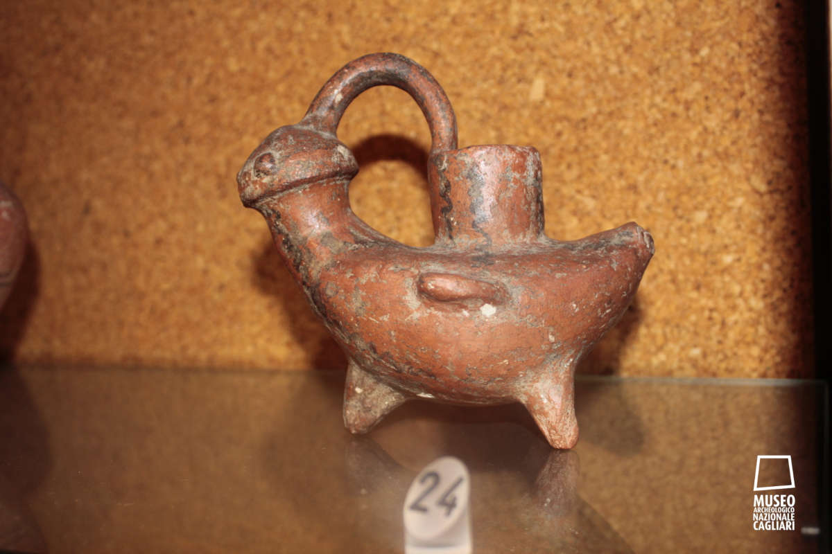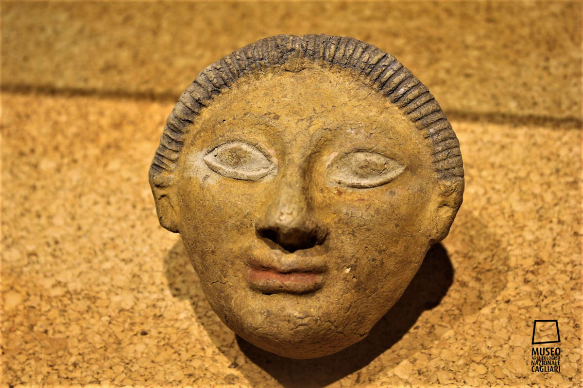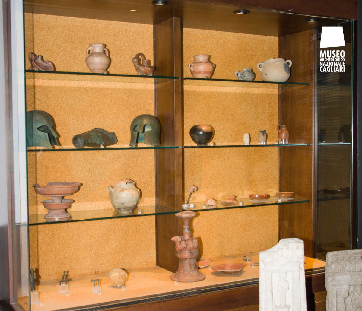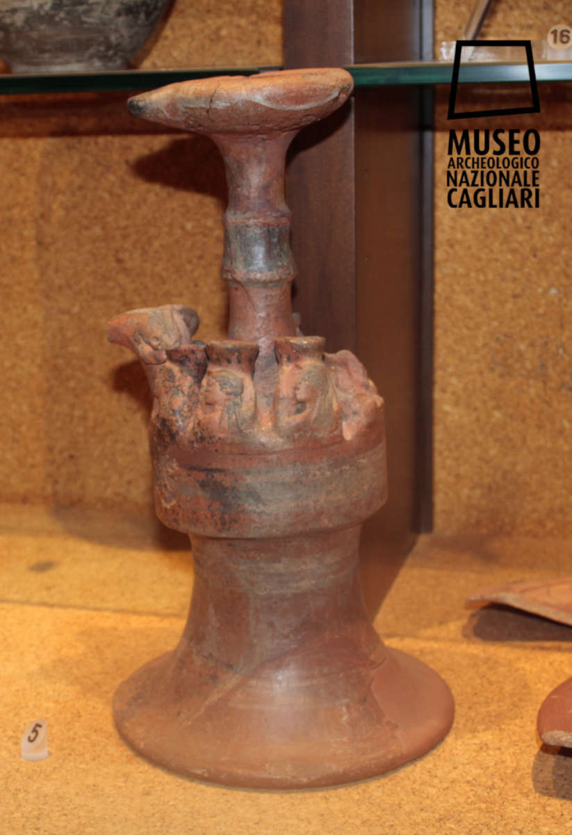 From the Phoenician Sulci we know other significant objects from old finds, such as a large double cup, oil lamps, animal-shaped askoi, a small amphora that takes up Hellenic shapes, a pair of helmets and a bronze greaves of Greek manufacture, an elaborate ritual vase in which the functions of lamp and kernos (a vessel with many openings in which offerings of different nature were placed) are combined, decorated with the representation of human faces and a votive plaque depicting a male face.