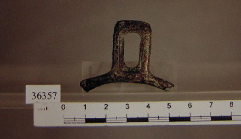 elemento a sezione tubolare ad andamento leggermente curvilineo e presa di forma rettangolare, anch'essa a sezione tubolare. probabile ansa di una tazza in bronzo
